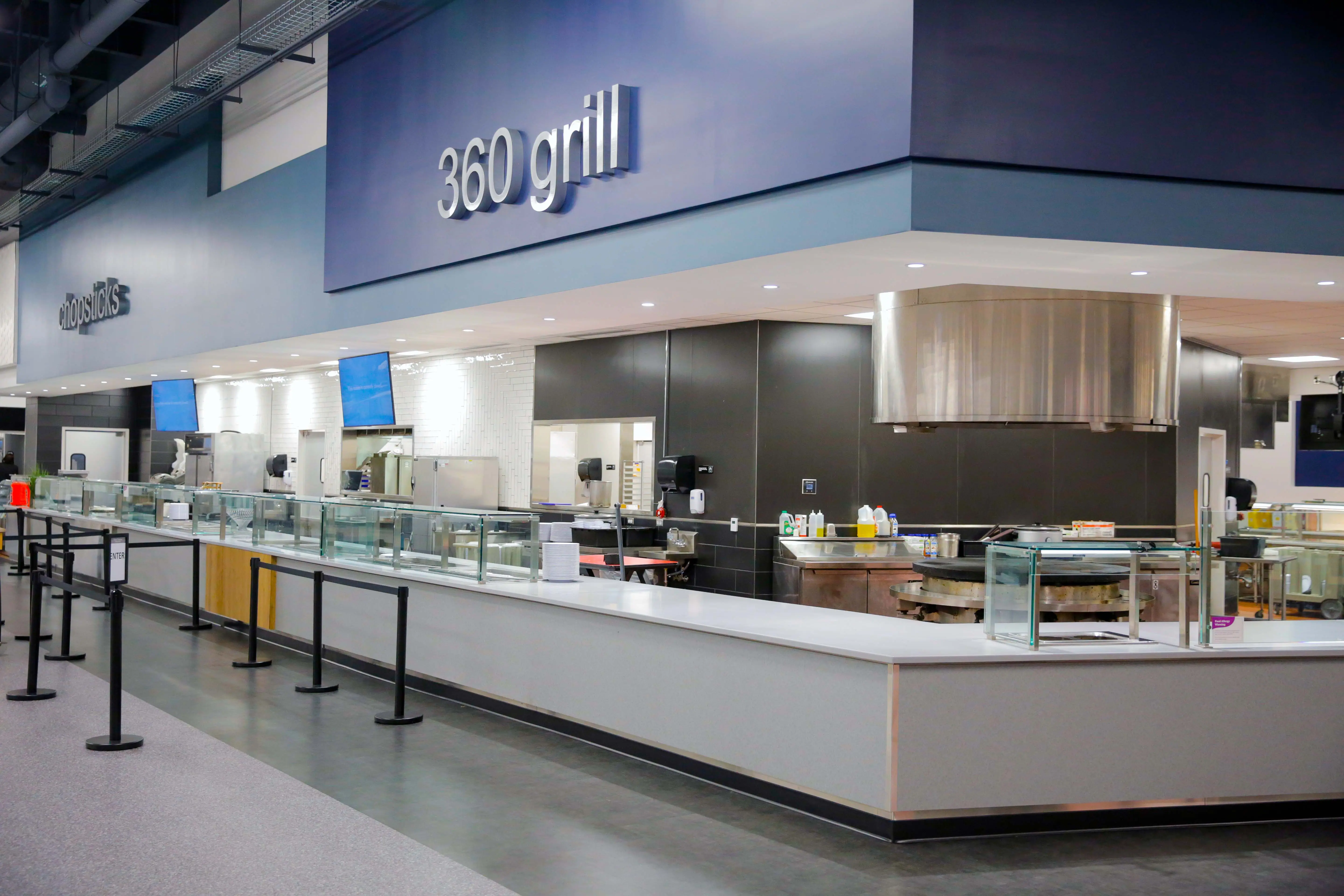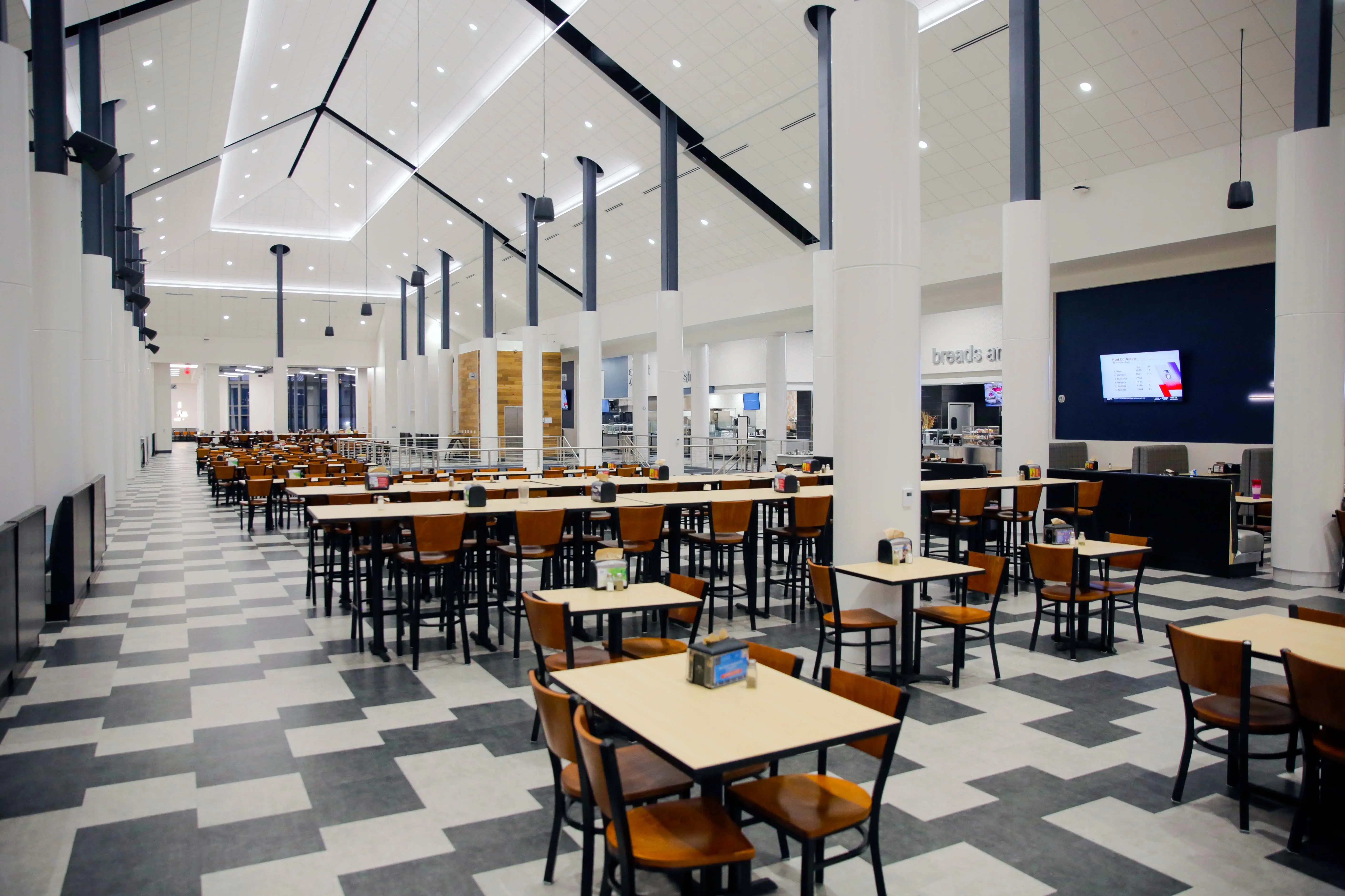 The design included additional booths, an assortment of small to large tables, and seats by the windows that offer views of the Academic Lawn and Liberty Lake. Students can eat downstairs in a lower-level seating section. An extended covered patio was also in the blueprint along with expanded overhead protection covering the main entrance and an increased number of turnstiles.